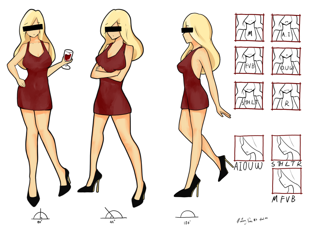 That was what I did eventually. I designed a bar lady with a short dress and a pair of high heels. I kept her cloth to be simple and erased tiny details like necklaces you can see from the sketch below. I did this to make sure I can have a easier life when doing my inbetweens.