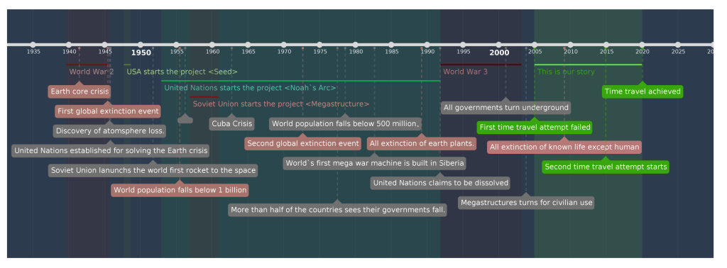 Instead of choosing to do a common nature generally recover the wasteland scene for the time trave part, I choose to use the citylight of human civilization to indicate that time has gone back. I dim the light of all other stars in the universe, as I want to show that the light of mankind is brighter than any stars.